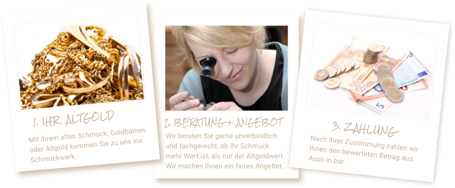 Als Goldschmiedeinnungsmitglied verbürgen wir uns für unsere Einschätzungen und beraten Sie gerne unverbindlich und fachgerecht, ob Ihr Schmuck (auch Goldbarren oder Zahngold) mehr wert ist, als nur den Altgoldwert. Es kann durchaus sein, dass sich gerade durch Diamanten höhere Erlöse erzielen lassen.