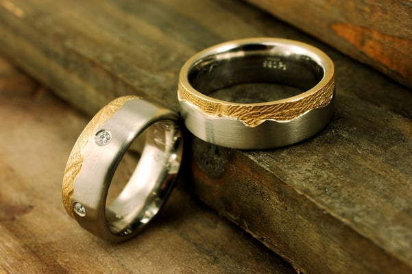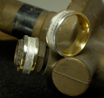 Ganz besondere Ringe entstehen mit der jahrhundertealten Mokume-Gane-Technik. Frei übersetzt heißt Mokume Gane "Metall mit Holzmaserung" - und damit ist das faszinierende Ergebnis schon sehr gut beschrieben. Bei Mokume Gane Ringen können Sie verschiedene Edelmetalle miteinander kombinieren. Diese werden in mehreren Schichten aufeinander geschmiedet und dann in vielen weiteren Arbeitsschritten mittels verschiedener Schmiedetechniken zu Ringen verarbeitet. Lassen Sie sich von uns begeistern, was alles möglich ist.